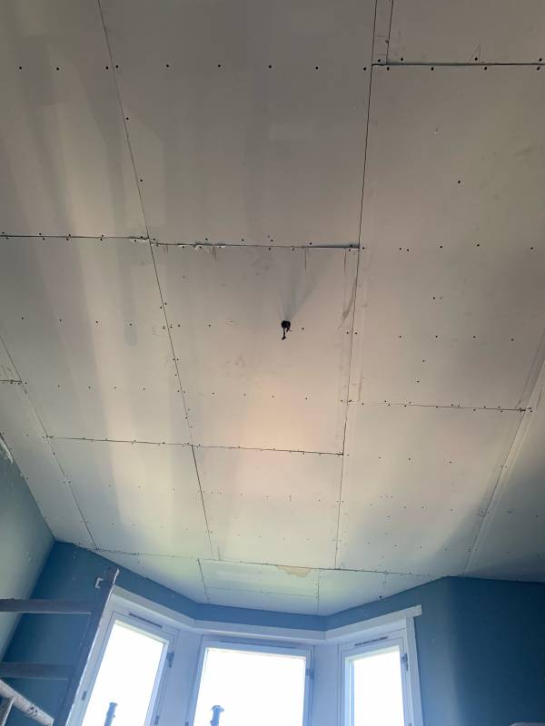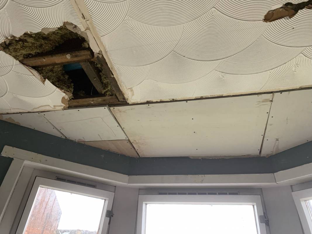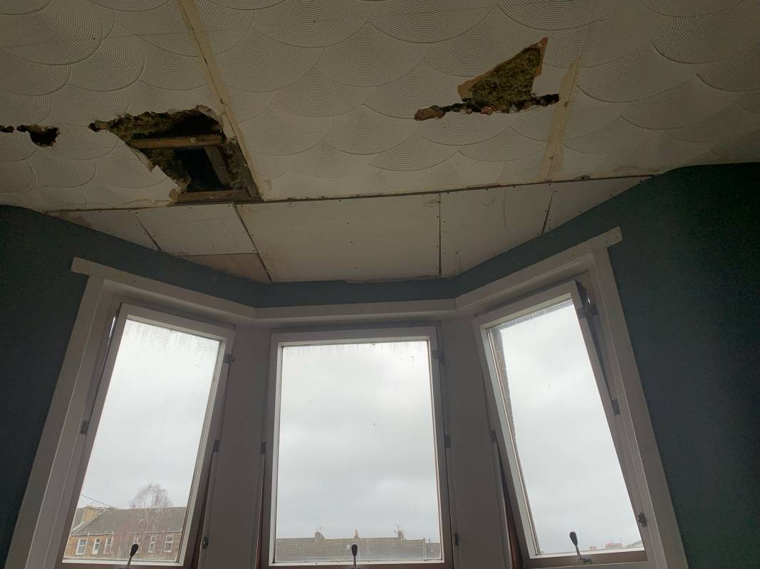 Roof leak in Shawlands, Glasgow. We carefully removed damaged roof boards and repaired the affected areas to prevent further issues. The entire ceiling was then overboarded for a strong, even surface, and plastered to a smooth finish, ready for repainting. Our professional services also include Artex removal in Glasgow, ensuring textured or outdated ceilings are fully prepared for a modern finish. Whether it’s ceiling repair, plastering, or full refurbishment after a leak, we provide high-quality, reliable work. Contact us today for roof leak repairs, ceiling restoration, and expert plastering services in Shawlands.
